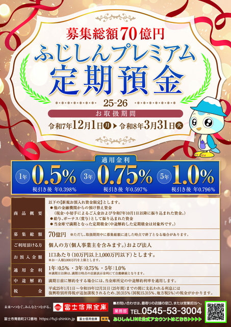 | お取扱期間 | 令和7年12月1日(月)〜令和8年3月31日(火) ※ただし、お取扱期間中に募集総額70億円に達した場合は、お取扱いを終了させていただきます。 |